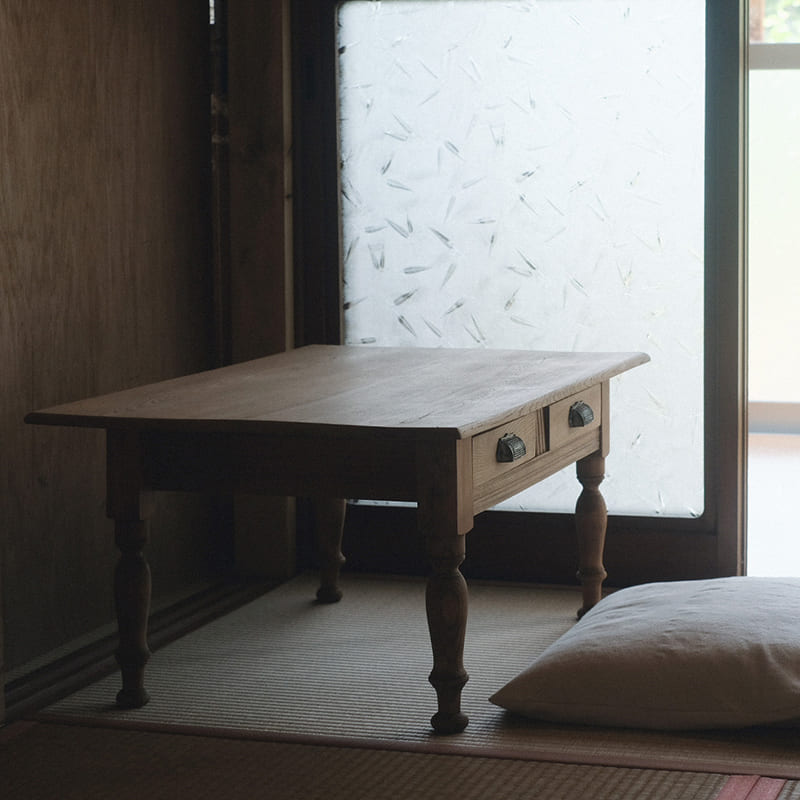 どこか懐かしい、深い茶色の文机席です。落ち着いたこころで思考の整理をしたいときに。